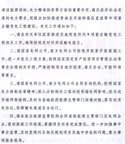 9月7日獲悉,國(guó)家能源局印發(fā)《關(guān)于加快推進(jìn)一批輸變電重點(diǎn)工程規(guī)劃建設(shè)工作的通知》國(guó)能發(fā)電力〔2018〕70號(hào),《通知》指出,為加大基礎(chǔ)設(shè)施領(lǐng)域補(bǔ)短板力度,發(fā)揮重點(diǎn)電網(wǎng)工程在優(yōu)化投資結(jié)構(gòu)、清潔能源消納、電力精準(zhǔn)扶貧等方面的重要作用,加快推進(jìn)青海至河南特高壓直流、白鶴灘至江蘇、白鶴灘至浙江特高壓直流等9項(xiàng)重點(diǎn)輸變電工程建設(shè),合計(jì)輸電能力5700萬(wàn)千瓦(工程見(jiàn)附件)。