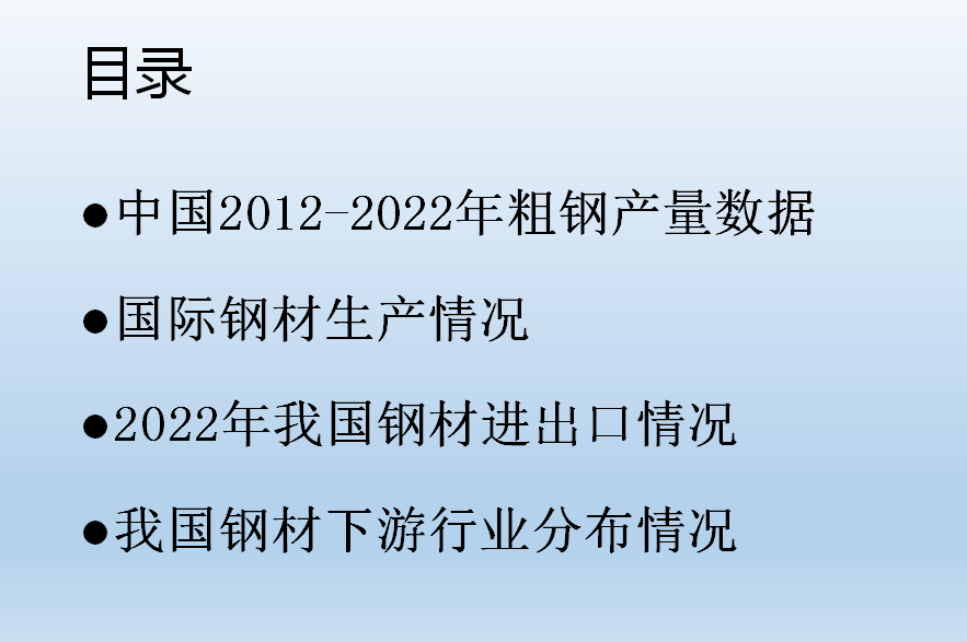 •我國現(xiàn)階段已經(jīng)初步實現(xiàn)城鎮(zhèn)化的建設(shè),隨著房地產(chǎn)需求的下滑,我們普通鋼材很難有一個大的增量,但是我國的特殊鋼材還有很大的發(fā)展空間。結(jié)合國家鋼材發(fā)展現(xiàn)狀,我們也慢慢的理解公司制定“高端、國有、人無我有”政策的現(xiàn)實依據(jù),希望大家能出通過了解行業(yè)發(fā)展的方向,明確目標,開發(fā)客戶,更好的規(guī)劃自己的銷售,取得好的業(yè)績。